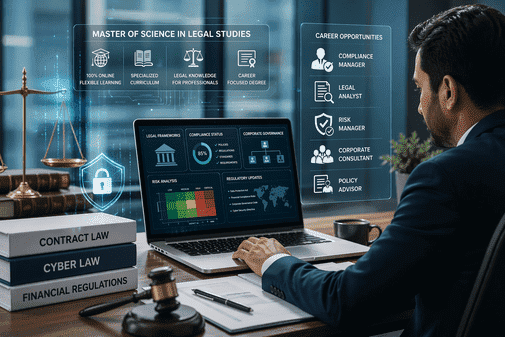 The curriculum covers contract law, corporate governance, legal research, policy analysis, cyber law, and financial regulations, helping learners build skills required for decision-making roles across industries. The 100% online master’s degree format provides flexibility, allowing professionals to continue working while upgrading their qualifications.